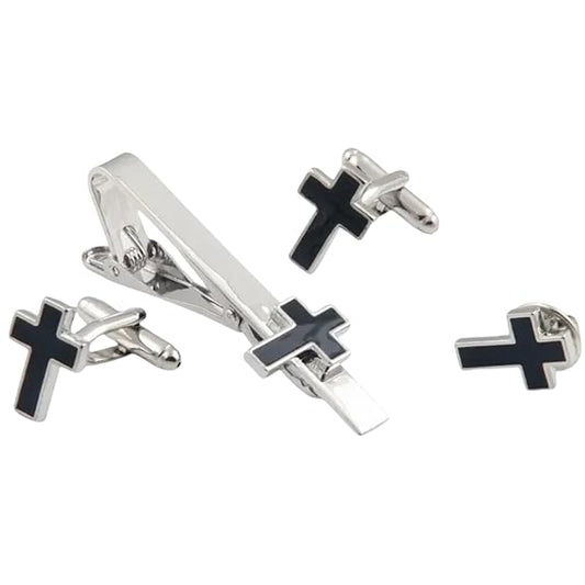 Moskai Black Cross Enamel Cufflinks and Tie Pin Set for Men