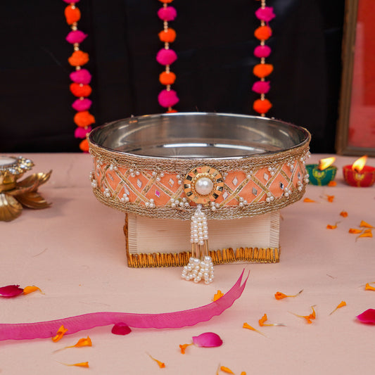 Peachy Mirror Magic Karwa Chauth Thali Set | Peach Colour Star Design