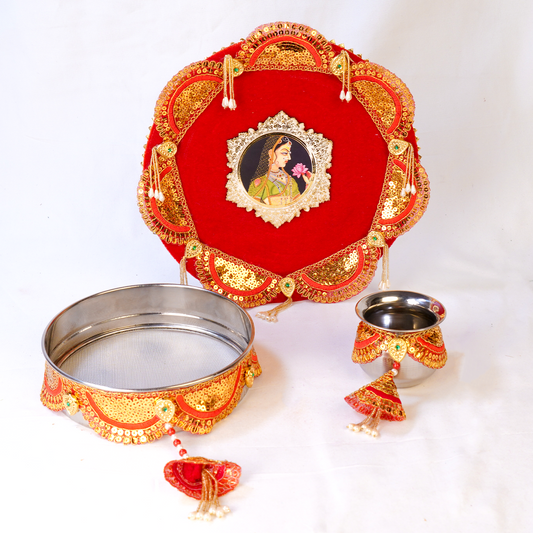 Red Designer Karwa Chauth Thali Set with Cover | Steel Thali Channi and Kalash