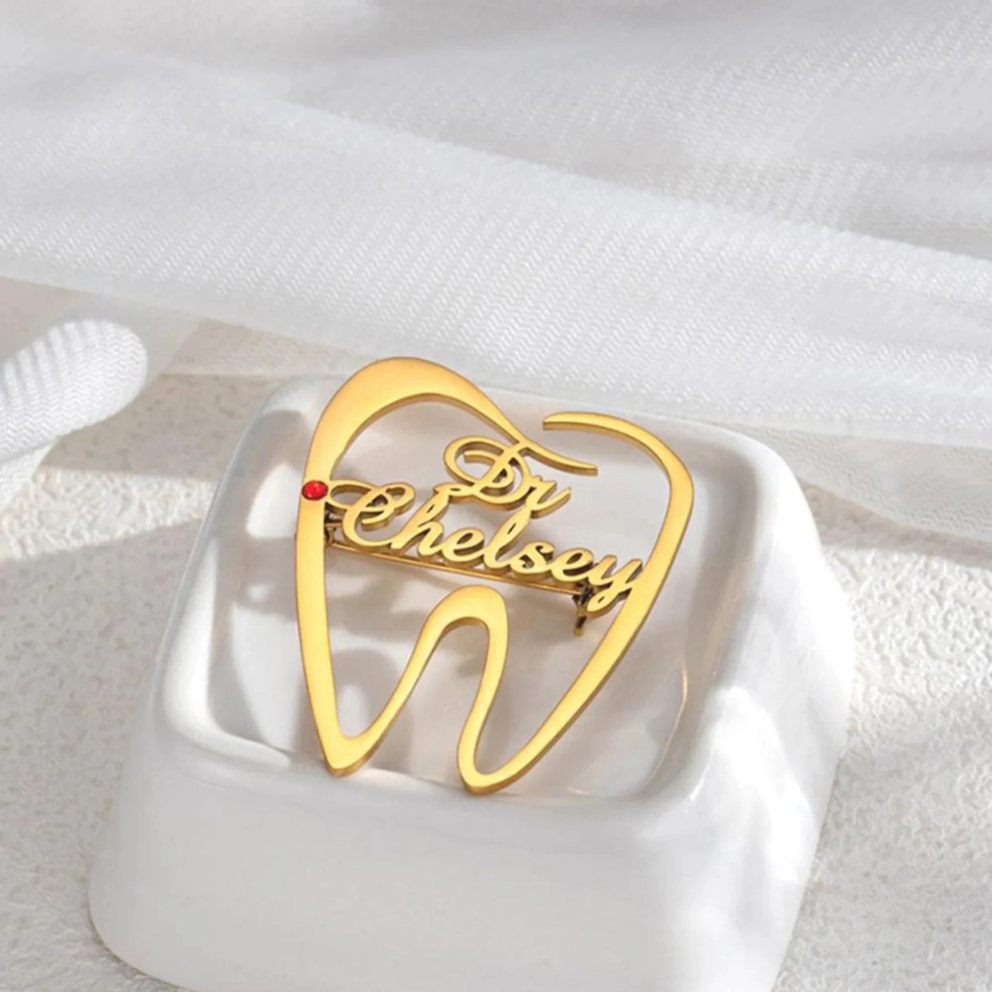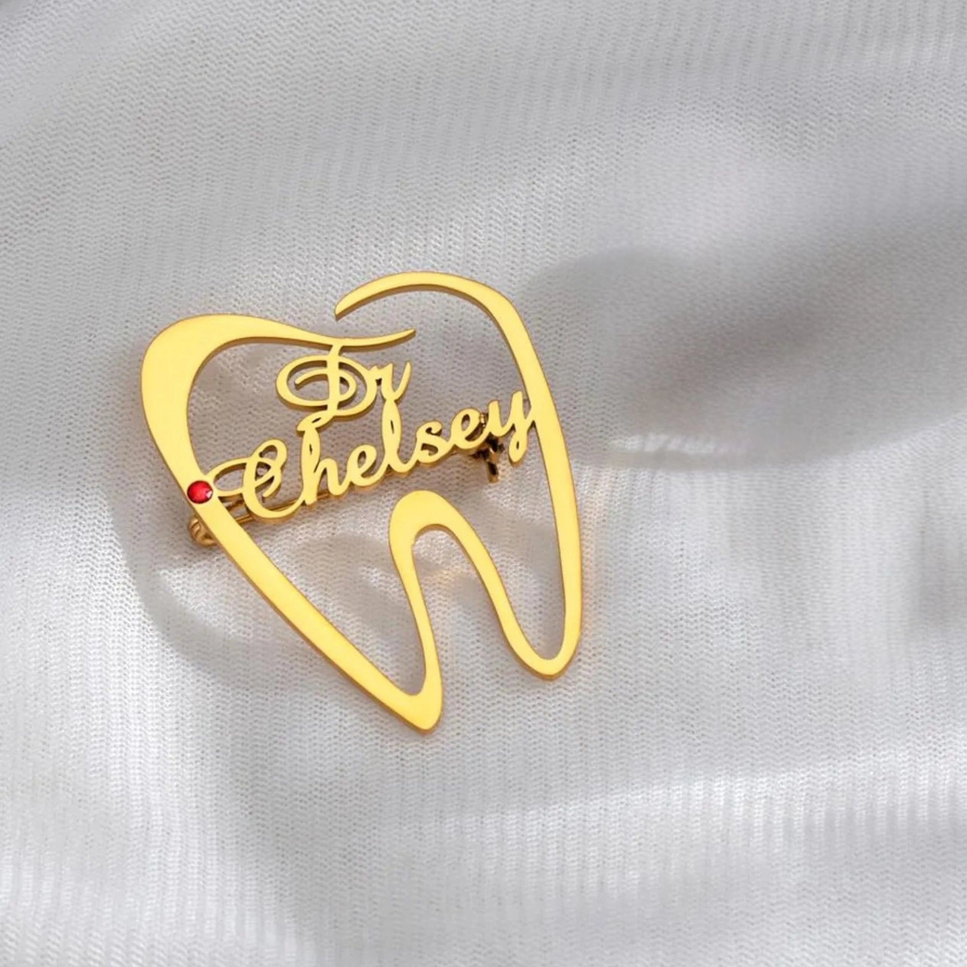 Customised Tooth Name Brooch Pin with Red Stone | Custom Dental Brooch
