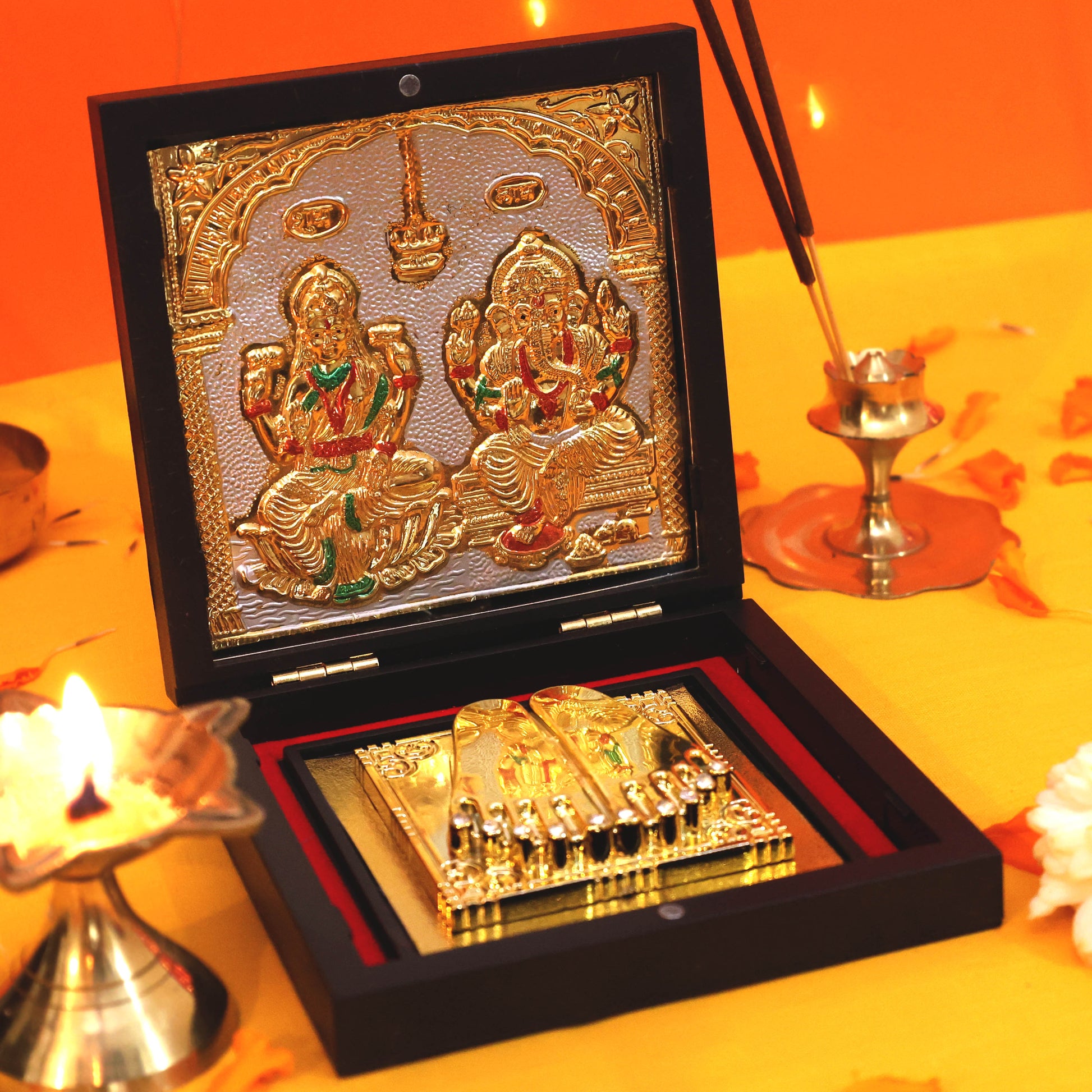 Moskai Golden Laxmi Ganesh Charan Paduka Box with Temple Artwork