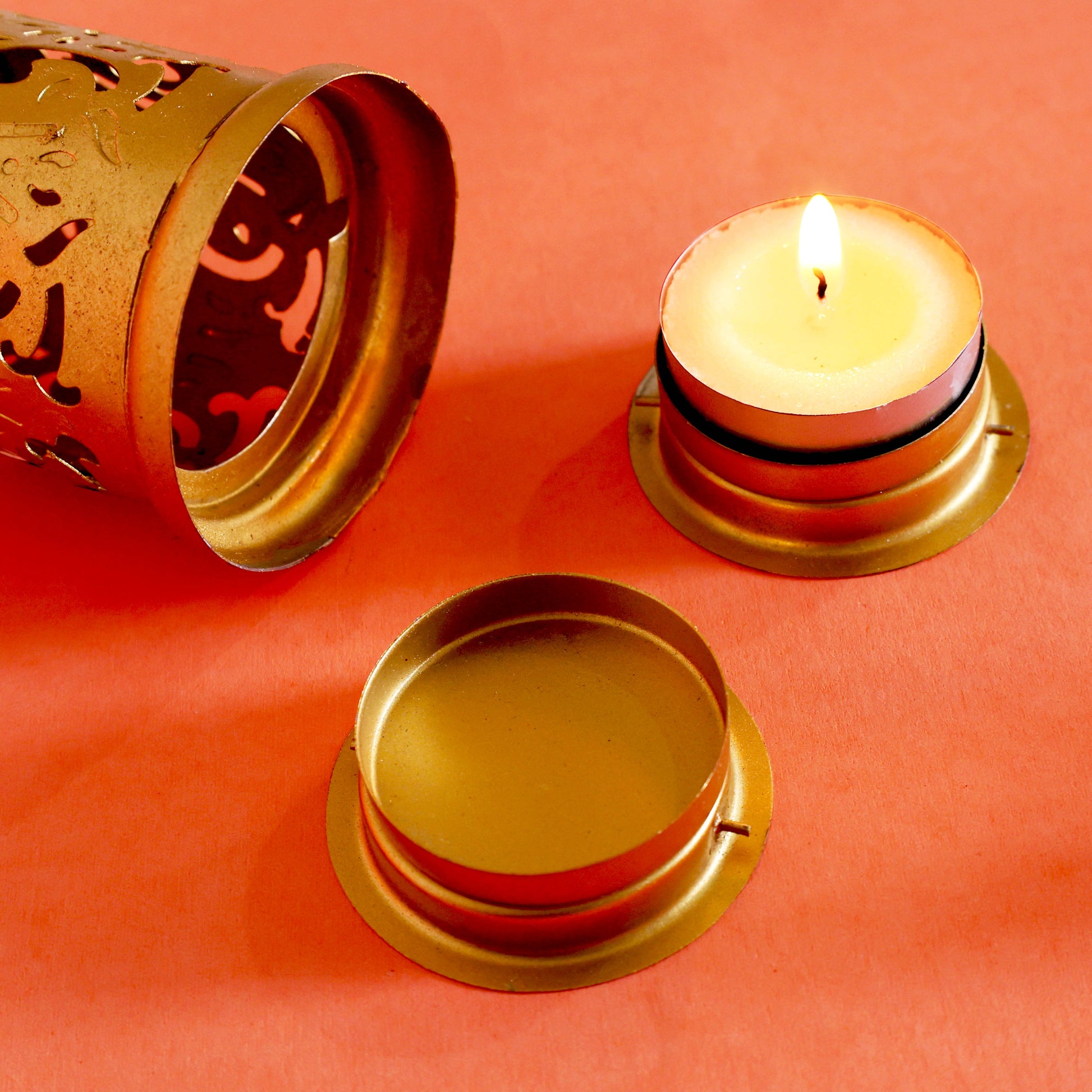 Enhance your home décor with the elegant Moskai Metal Lantern with Tealight Candles. Designed with intricate cutwork patterns and a premium golden finish, this lantern adds a warm and ambient glow to any setting. Perfect for festive decorations, pooja rooms, weddings, balconies, and living spaces, it creates a soothing atmosphere with its soft candlelight. The sturdy metal construction ensures durability, while the included tealight candles make it ready to use. Ideal for both indoor and outdoor spaces, this lantern combines traditional charm with modern elegance.