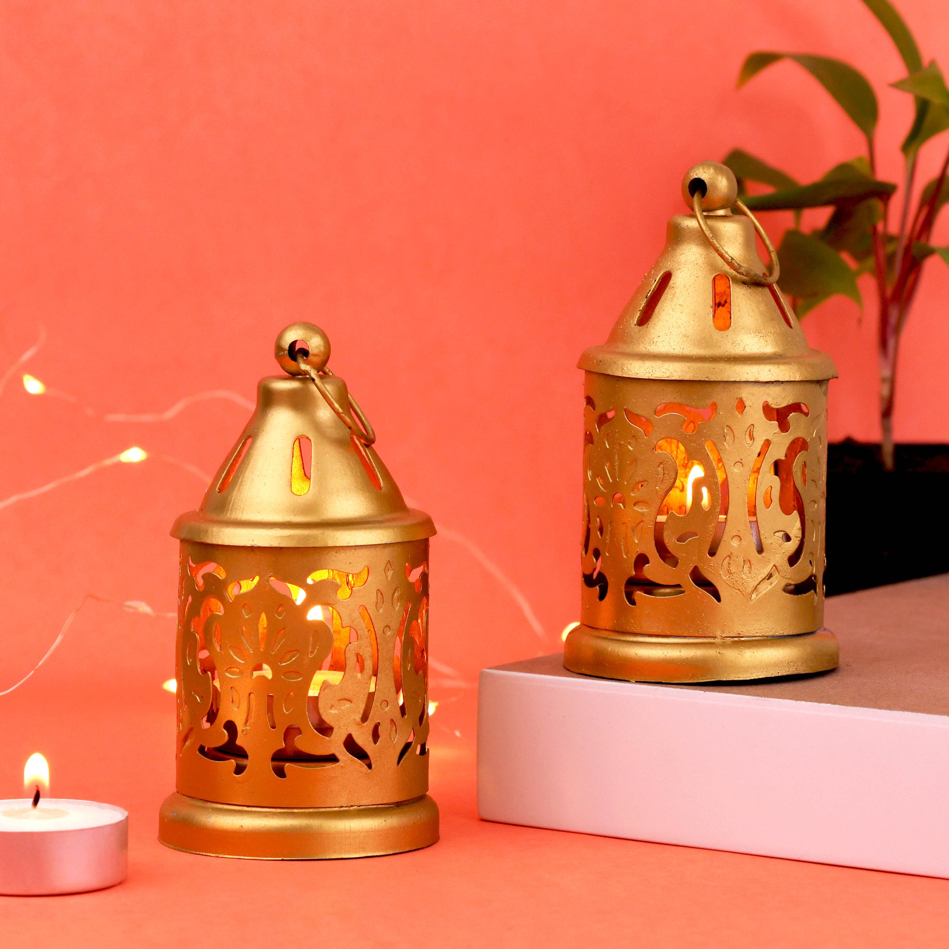 Moskai Metal Lantern with Tealight Candles | Decorative Hanging Candle Holder Set of 2