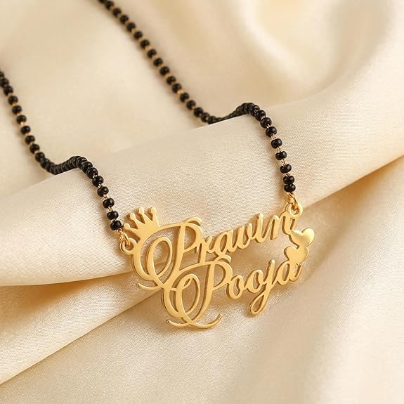 Celebrate love and lifelong commitment with the Moskai Personalized Couple Name Mangalsutra featuring an elegant Crown Design. This customized mangalsutra beautifully displays both partner names under a royal crown motif, symbolizing respect, togetherness, and everlasting bond. Crafted with traditional black beads and a premium gold plated finish, it blends Indian tradition with modern personalization. Lightweight, skin-friendly, and durable, this couple name mangalsutra is suitable for daily wear as well as special occasions. A perfect gifting option for weddings, anniversaries, engagements, Karva Chauth, Valentine’s Day, and birthdays.